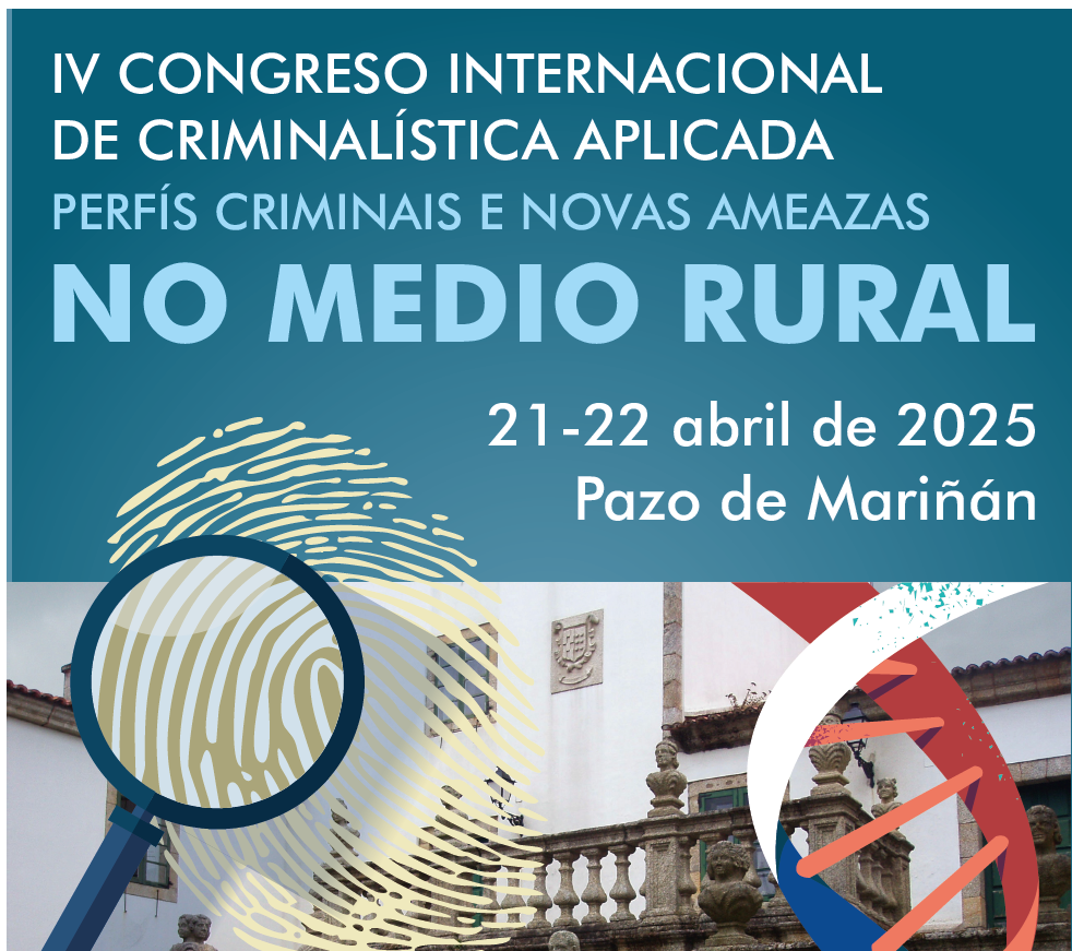 Los días 21 y 22 de abril, en el Pazo de Mariñán, organizaremos conjuntamente con INICA, bajo el patrocinio de la Diputación de A Coruña y la colaboración del Colexo de Avogados de Santiago, de la USC, UNED y UC, entre otros organismos, el IV Congreso de Criminalística aplicada, «perfís crimináis e novas ameazas no medio rural».